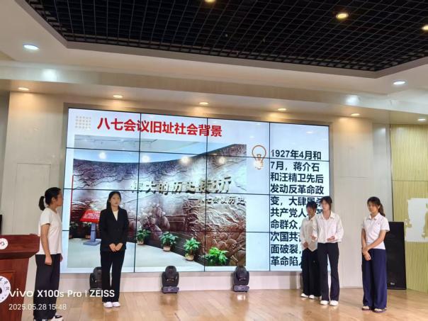 有的团队聚焦历史事件,如“八七会议旧址社会背景” 展示,同学们运用多媒体手段,详细讲解了1927年蒋介石和汪精卫发动反革命政变后共产党面临革命危机的复杂历史背景,生动再现了当时社会的动荡不安以及共产党人不屈不挠的斗争精神。