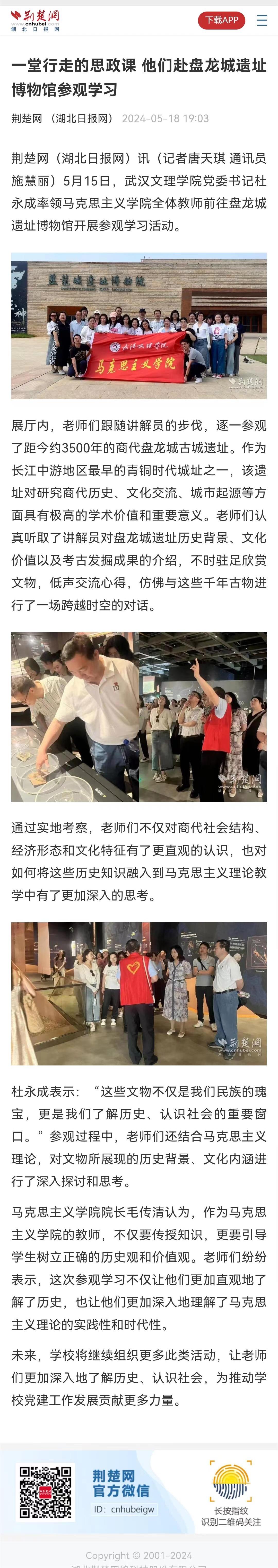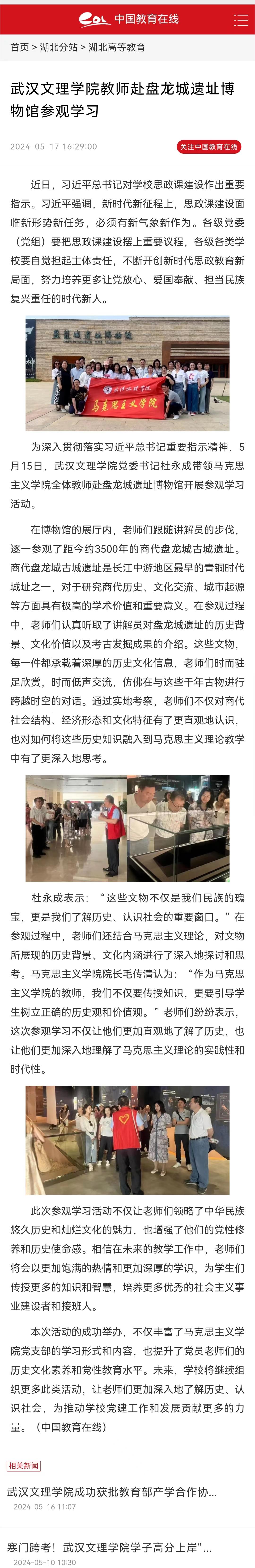 5月15日,武汉文理公司党委书记杜永成率领bw必威西汉姆联官方网站全体教师前往盘龙城遗址博物馆开展参观学习活动。荆楚网(湖北日报网)、中国教育在线等媒体进行报道。以下为相关报道内容。